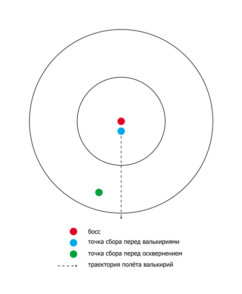 | В общем так. Пока рейд конкретно на осквернение не научится очень быстро разбегаться будем вайпаться. Валек сносит весь рейд очередность проста как дважды два. 1. Валькирии налетают на свои цели по очереди. 2. Как только валькирии взяли цели рейд тут же разбегается в рассыпную поближе к краю. 3. на месте где стоял рейд лежит либо хантовский каток либо тотем земных оков шамана. В общем сначала идея их замедлить. 4. Первую валькирию не станят, а замедляют и дают лететь. Её сносят всем рейдом. Тут проблема в том, что рейд должен видеть ПЕРВУЮ. 5. Вторую и третью станят. После первой убивается вторая на замедлении дпса должно хватать. Если не хватает её станят опять но только на краю. 6. Третью третьим станом тоже только на краю. На осквернении рейд должен разбегаться иначе никак! причем человек с осквернением должен бежать максимально к краю платформы. Все остальные должны это видеть и бежать наоборот